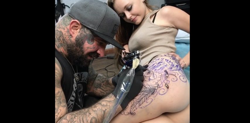 Una piccola "opera d'arte" sulla gamba della ragazza, un tatuaggio che ricopre anche parte del gluteo: il lavoro quasi ultimato del tatuatore.