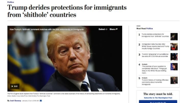 "Perché abbiamo tutta questa gente da Paesi... 'sporchi'?", avrebbe dichiarato Trump usando in realtà la parola "shithole" e riferendosi a Haiti ed ai Paesi africani. Secondo lui, gli Stati Uniti dovrebbero invece puntare su gente in arrivo dalla Norvegia, il