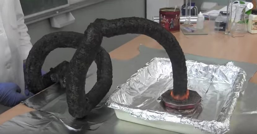 Si chiama esperimento del serpente nero, per la protuberanza nera che emerge quando viene accesa. Si tratta di una reazione chimica che prevede la carbonizzazione dello zucchero. Come avviene? Con il bicarbonato di sodio mischiato a zucchero che vengono messi su una superficie di sabbia bagnata con liquido infiammabile e innescati con il fuoco: la sostanza nera che fuoriesce è il cosiddetto "serpente" ed è abbastanza lungo. Fonte video: https://www.youtube.com/watch?v=iKtB_uACiQc