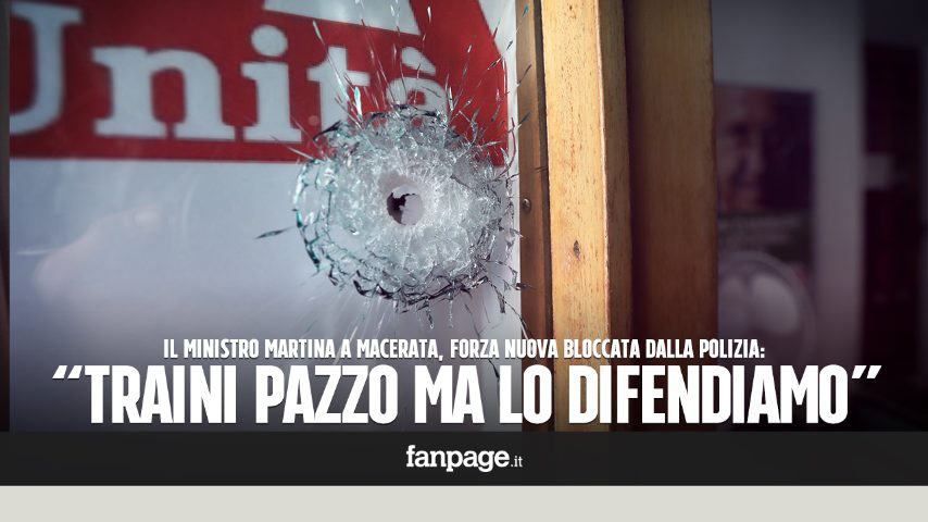 Il ministro Riccardo Martina visita la sede del Pd di Macerata colpita da Traiti durante la sua folle sparatoria, all'esterno si presenta una delegazione sparuta di membri di Forza Nuova che viene bloccata dalla polizia: "Pagheremo le spese legali di Traini, ma lui è un pazzo".