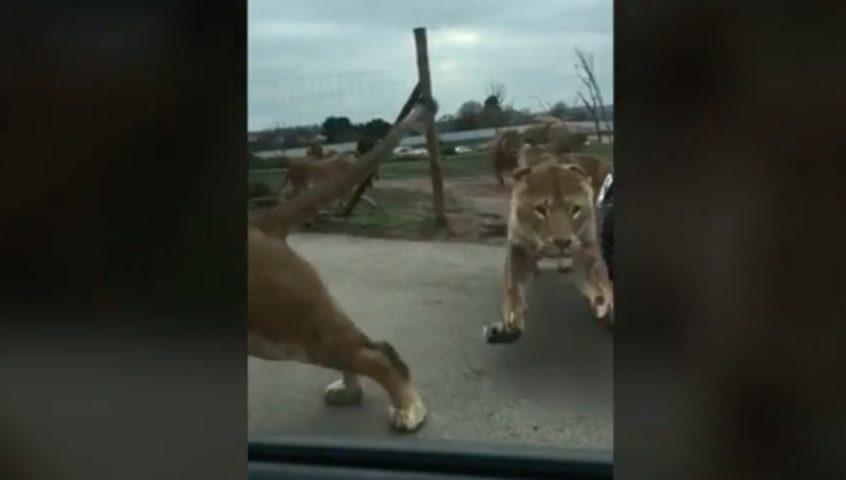 Qualcosa è andato storto nello zoo safari, West Midlands Safari Park, di Bewdley, Inghilterra. Una coppia, con due bambini sul sedile posteriore, è rimasta intrappolata nell'area dei leoni, chiusa mentre i guardiani cercavano di affrontare gli animali insolitamente "agitati" e "aggravati". Nel video si vede il momento in cui un esemplare del branco improvvisamente è saltato sul tettuccio della macchina, danneggiandolo.