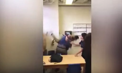 Video registrato con uno smartphone in una High School di Greensboro nello stato di New York. Un insegnante alza di peso un alunno che aveva provato ad aggredirlo e lo scaraventa al suolo.