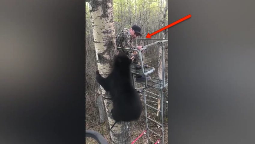 Un orso si arrampica su un albero dove c'è un giovane cacciatore seduto nel chiosco. Come dicono gli esperti, bisogna mantenere la calma in certe situazioni, cosa che fa il ragazzo sull'albero: non si agita e non viene attaccato dall'animale.