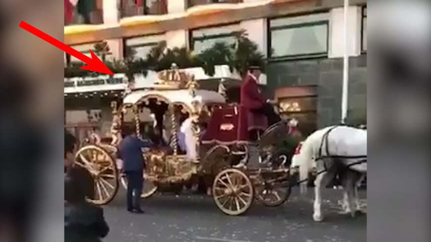 Sul lungomare di Napoli si celebra la prima comunione di una bambina con carrozza dorata trainata da cavalli e sbandieratori. La scena è stata ripresa dai passanti sbigottiti.