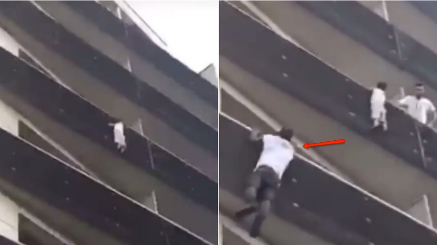 Bambino sta per precipitare: eroico soccorritore si arrampica a mani nude per salvarlo