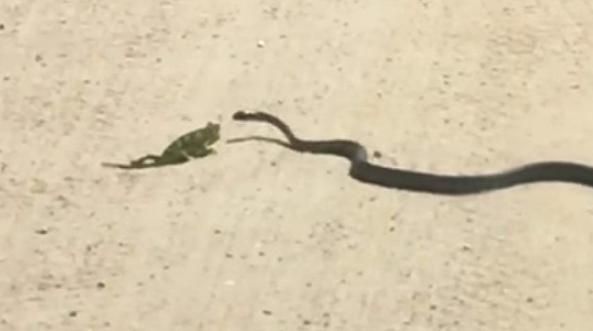 Per il piccolo camaleonte si mette malissimo: il serpente si avvicina inesorabile ed ecco cosa accade