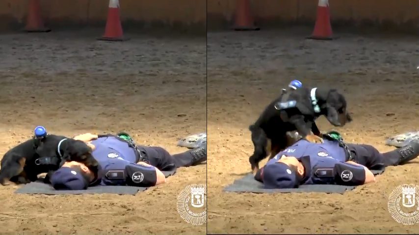 In una simulazione effettuata sul campo di addestramento un cane poliziotto esegue la pratica di rianimazione su poliziotto. L’uomo finge di avere un malore così il cucciolo si avvicina ed esegue la rianimazione cardio polmonare con le zampe anteriori sul petto, mentre col muso si avvicina al collo per verificare se abbia ripreso la respirazione. Alla fine il poliziotto si alza ed abbraccia calorosamente il piccolo animale tra gli applausi generali.