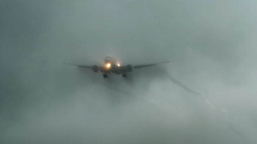 Un aereo di linea sta atterrando sulla pista quando attraversa un’intensa pioggia. L’aria è così densa di acqua che dalle ali si generano dei vortici d’aria che creano un effetto davvero particolare.