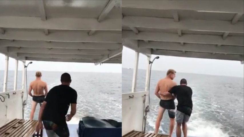 Il ragazzo è di spalle e l'amico vuole gettarlo in mare, ma lo scherzo gli si ritorce contro. Infatti è proprio lui ad essere gettato dalla barca e a finire in acqua con tutti i vestiti.