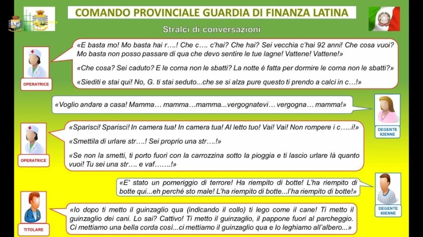 Le immagini mostrano alcune immagini riconducibili ai maltrattamenti subiti dagli ospiti di una casa di riposo di Terracina, in provincia di Latina, chiusa e sequestrata dalle Fiamme Gialle. In particolare, alcune intercettazioni immortalano le violenze che emergono dalle conversazioni tra i dipendenti e gli ospiti della struttura. Tre gli arresti.