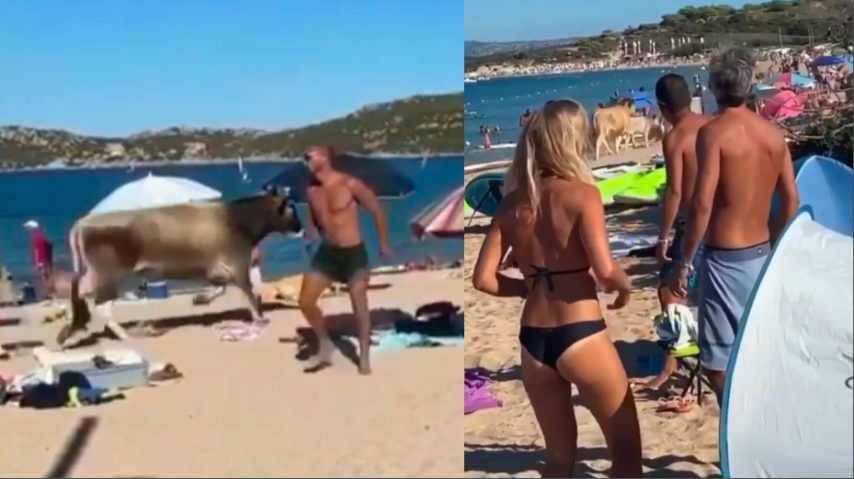 Isola dei Gabbiani, Sardegna. D'improvviso in spiaggia arrivano le mucche tra la sorpresa e la paura dei bagnanti che se la danno a gambe.