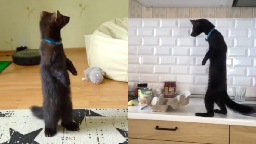 Ha le movenze e le sembianze di un gatto, in realtà si tratta di uno zibellino, una specie di martora. È un piccolo mammifero onnivoro che vive principalmente nelle foreste russe. Buddy, questo il nome dell'animale nelle immagini, è stato salvato e prelevato da una fattoria nel 2018 e vive con questa donna a cui è molto affezionato. Le sue "imprese" sono seguite su Instagram con un account a lui dedicato.