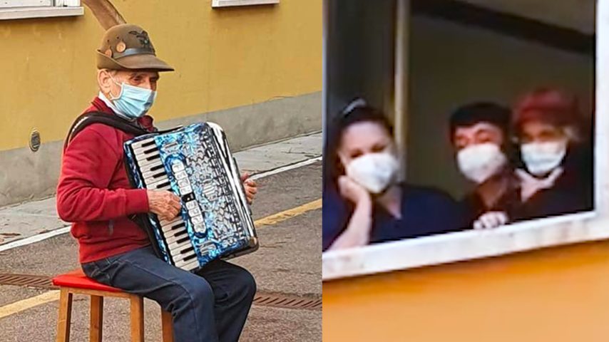 Seduto su uno sgabello di legno stringe tra le mani una fisarmonica: è solo, nel cortile dell’ospedale, con lo sguardo alto verso la finestra dove è ricoverata la moglie malata, che non può incontrare a causa delle norme anti-Covid.