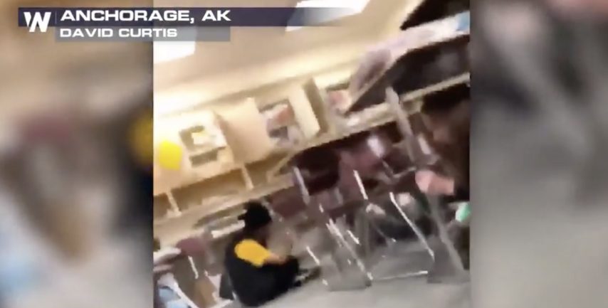 Attimi di paura in classe durante la violentissima scossa di terremoto: gli studenti si mettono al riparo sotto i banchi e intanto nell'aula va via anche la luce; la scena arriva da Anchorage, epicentro della seconda delle due scosse di terremoto che hanno colpito l'Alaska.