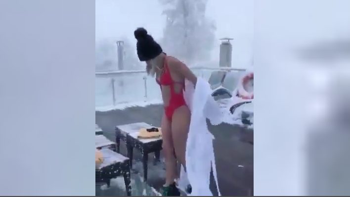 Nonostante le temperature proibitive, questa ragazza non mostra alcuna remora a spogliarsi e fare un bel bagno, come se fosse piena estate.