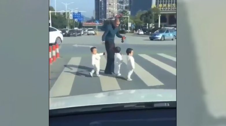 Il segnale acustico avvisa che tra poco il semaforo sarà rosso: papà così afferra i suoi tre figli in un unico abbraccio e corre verso il marciapiede.