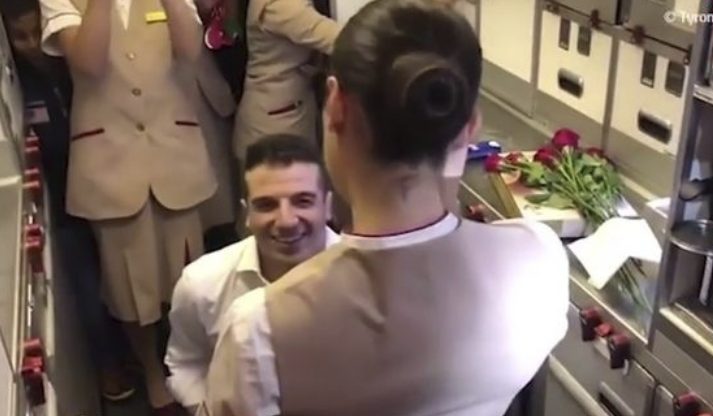 Stefano, con la complicità dell'equipaggio su un volo Dubai-Roma, si è dichiarato alla sua Vittoria, hostess dell'Emirates, chiedendole di sposarlo. Il ragazzo ha preparato tutto al meglio, rose e cuori rossi, chiedendo anche ai passeggeri di indossare una stampa con la sua foto.