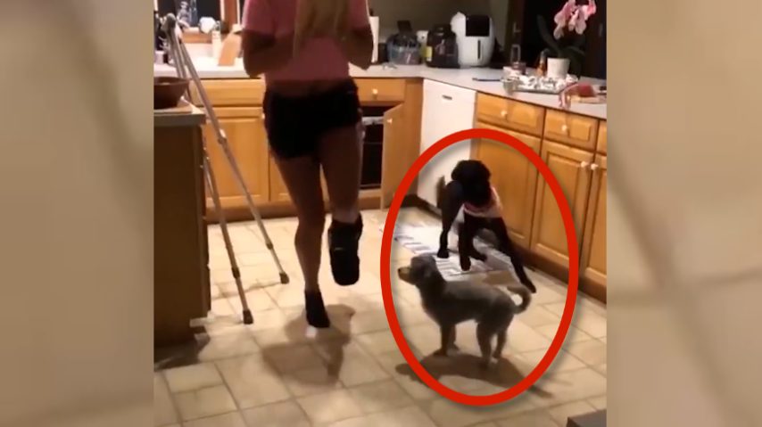 Questa donna si è rotta un piede ed è costretta a camminare così in casa: i suoi cani sono così solidali con lei che l'accompagnano e uno di loro finge di zoppicare: davvero un amore.