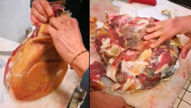 Emerge un video sui social network in cui alcuni ragazzi mostrano un prosciutto che definiscono "cinese"; non c'è bisogno del coltello per tagliarlo e dentro ci sono "pezzi di maiale", "c'è un pezzo d'osso" e la "cotica" come commentano mentre lo aprono. "Questi non sono altri che gli scarti della lavorazione del prosciutto quando lo affettano" dicono alla fine.