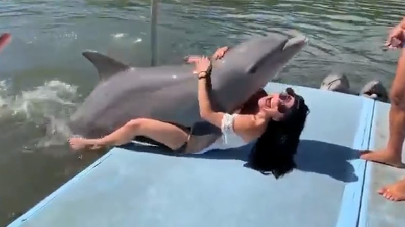 Delfino salta addosso a una ragazza che tenta di abbracciarlo