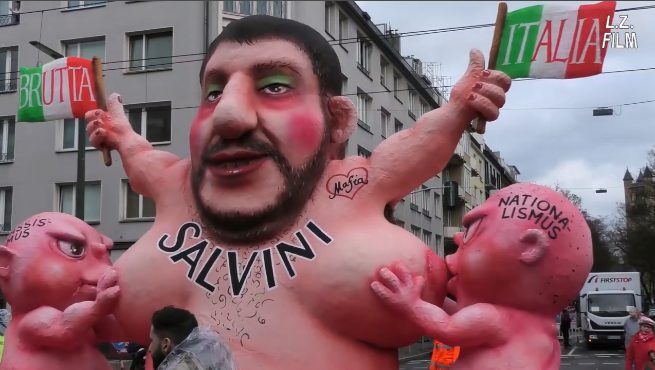 Al Carnevale di Düsseldorf c'è un carro dedicato a Matteo Salvini, raffigurato col corpo di una donna che allatta due bambini: che simboleggiano il razzismo e il nazionalismo. Nelle mani tiene due bandiere tricolori con su scritto "Brutta Italia", mentre sul corpo c'è un tatuaggio a forma di cuore al cui interno c'è la scritta "mafia". Lo stesso Matteo Salvini ha condiviso la foto sui suoi profili social commentando con una faccina sorridente.