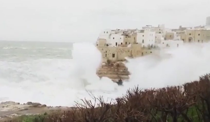 Polignano a Mare, Bari, una violentissima mareggiata si è abbattuta sulla suggestiva cittadina puglise. Le onde sono altissime e superano le case.