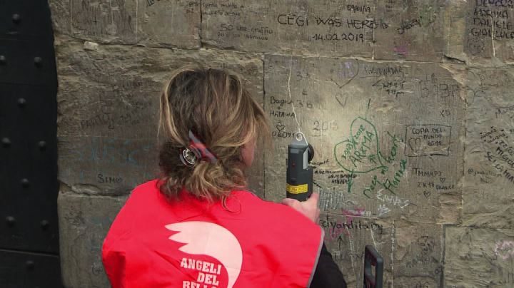 I volontari gli "Angeli del Bello" in azione su Ponte Vecchio Roma, 8 mar. (askanews) - Ripulire i monumenti, i muri e i siti famosi in tutto il mondo con l'aiuto della tecnologia. A Firenze, un gruppo di volontari, gli "Angeli del Bello" che hanno da tempo deciso di dedicarsi a rendere migliore la città, recuperandone il decoro, con un laser di ultima generazione ora possono cancellare scritte e graffiti più facilmente. Eccoli in azione su Ponte Vecchio. Daniela Valentini, restauratrice e volontaria: "Mi piacerebbe molto che i ragazzi vedessero quanto poco tempo loro hanno impiegato per lasciare una firma o il loro messaggio e quanto tempo, quanta energia e difficoltà troviamo noi per rimuoverlo". "Per noi è frustrante vedere che oggi riusciamo a togliere un metro quadro di scritte vandaliche e poi domattina magari ne troviamo altrettante". Il lavoro di rimozione è lungo, anche se il laser a fibra di nuova generazione permette di pulire le superfici con maggior velocità, non danneggiando in alcun modo i monumenti. Come assicura Paolo Salvadeo, general manager del gruppo El.En, leader nel settore, che lo ha sviluppato: "La superficie non viene danneggiata, questo tipo di laser per la tipologia di impostazione a bassa energia per impulso e alta frequenza di ripetizione può lavorare su tutti i colori senza creare danni o rimozione della superficie".
