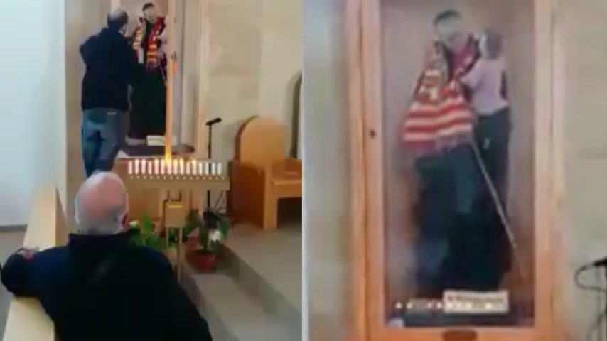 Il parroco è tifosissimo: anche il santo in chiesa indossa la sciarpa