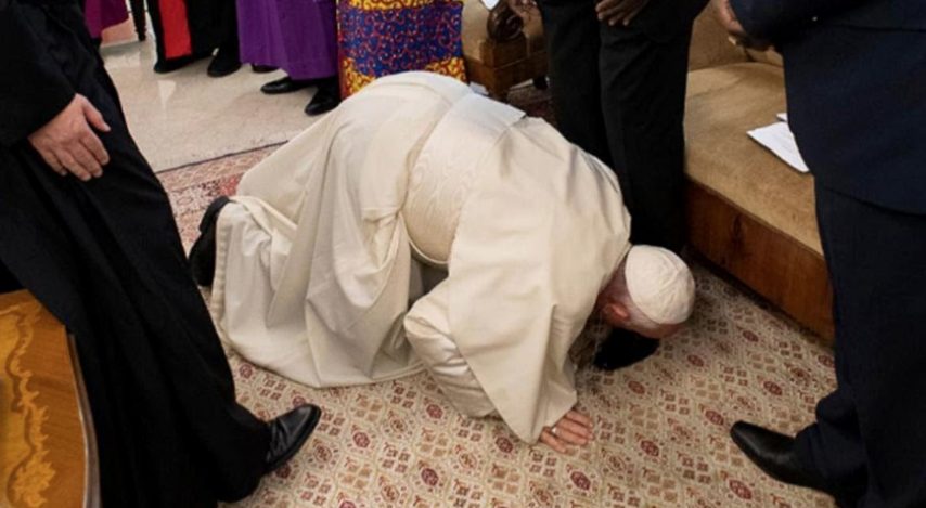 Ha destato stupore, e non solo nel mondo cattolico, il gesto di papa Francesco di inginocchiarsi a baciare i piedi dei leader politici del Sud Sudan per chiedere loro “come un fratello” di pacificare il Paese, martoriato da anni di guerra civile. Si è trattato di un gesto senza precedenti per un successore di San Pietro.