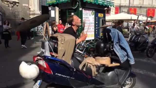 Oggi, forse anche grazie alla giornata di sole e al gran caldo, in piazza Trieste e Trento si è rivisto Mario, che tutti in città chiamano "il batterista rivoluzionario", l'uomo che suona le percussioni su una batteria improvvisata sul suo scooter. Era da tempo che Mario non si esibiva per le strade di Napoli: qualche tempo fa, il suo scooter era stato addirittura sequestrato dalle forze dell'ordine.