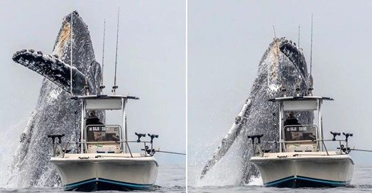 Una megattera fa un incredibile salto vicino a questa barca: le immagini rendono l'idea delle notevoli dimensioni del cetaceo rispetto all'imbarcazione.
