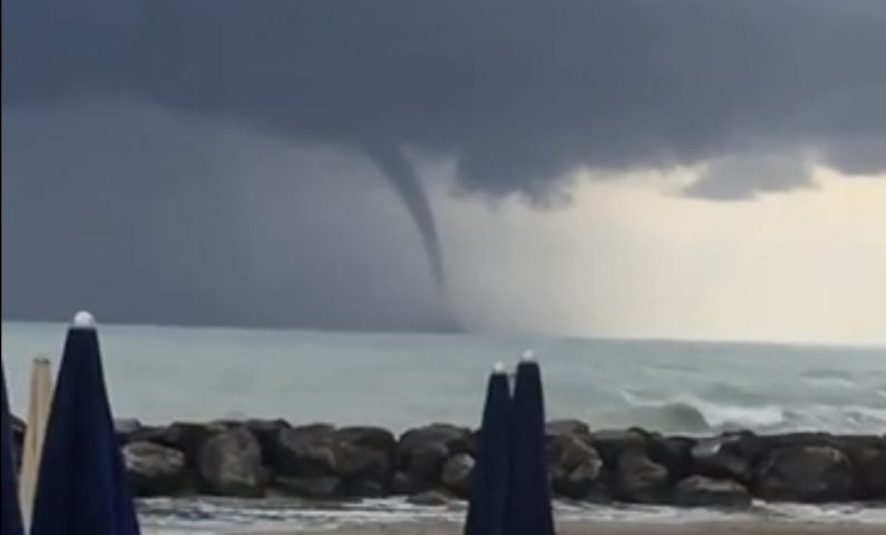 Tromba marina al largo di Cesano di Senigallia (AN), questa mattina. I bagnanti hanno ripreso spaventati la scena.