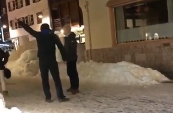 Cortina d’Ampezzo, Dolomiti, un uomo non indossa la mascherina e cammina tranquillo per le strade innevate. Questo scatena la rabbia di un passante che lo insulta spiegandogli che portare la mascherina è importante.