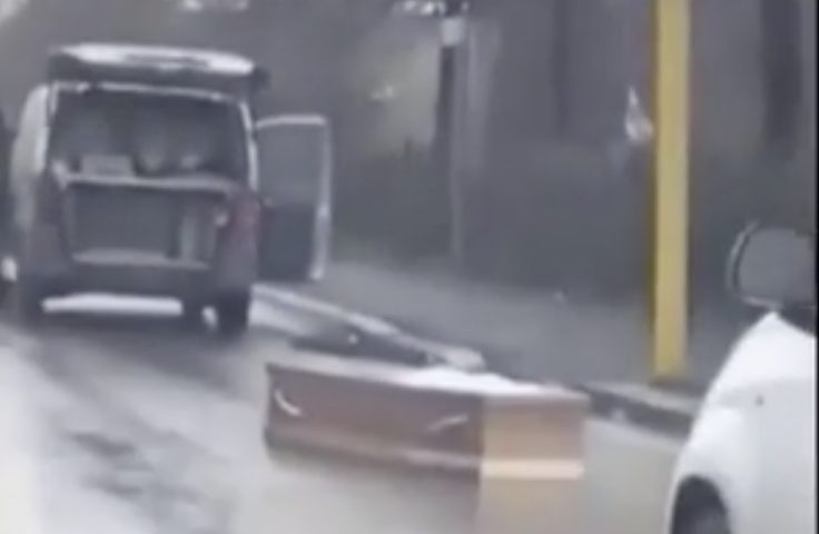 È successo a Scandicci, vicino Firenze, dove per cause da accertare (un errore di distrazione di uno degli operatori o per un guasto meccanico) il portellone del carro funebre si è aperto. Nel momento in cui il mezzo ha accelerato per ripartire, la bara è scivolata cadendo in strada.