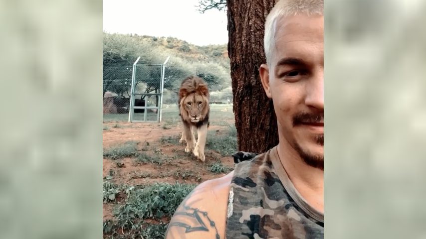 Fa un videoselfie quando spunta un leone alle spalle: da brividi
