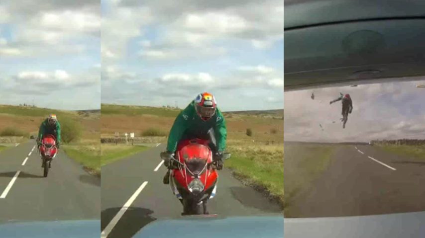 Incidente frontale a 120 km/h: motociclista sbalzato in aria ma salvato dalla speciale tuta