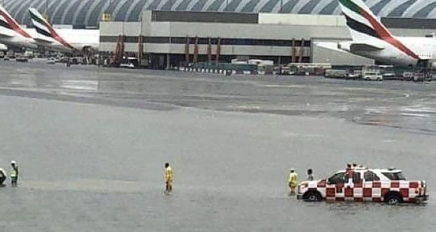 Le piste dell'aeroporto di Dubai coperte da decine di centimetri di acqua, dopo che ieri incessanti piogge hanno provocato danni alla viabilità aerea dell'importante scalo degli Emirati Arabi Uniti.