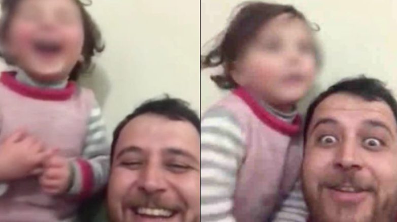 Commovente quanto triste questo video in cui un padre siriano, è costretto a inventare un gioco per non far spaventare la piccola figlia durante i bombardamenti sulla città di Idlib. Ogni volta che una bomba esplode i due ridono, così da esorcizzare i tragici momenti che vive la popolazione ormai da anni. Il video è stato pubblicato da Mehmet Algan, ex deputato del Partito della Giustizia e dello Sviluppo turco della regione di Hatay.