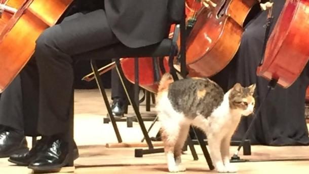 Il gatto è la star del concerto: passeggia tra gli orchestrali e si gode la musica