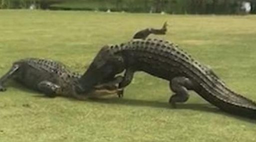 Alla buca 18 del campo dell'Hilton Head Lakes a Hardeeville, in Carolina del Sud, alcune persone hanno filmato la lotta per il territorio tra due grandi alligatori. I rettili si sono sfidati e avvinghiati per quasi due ore, come hanno raccontato i presenti.