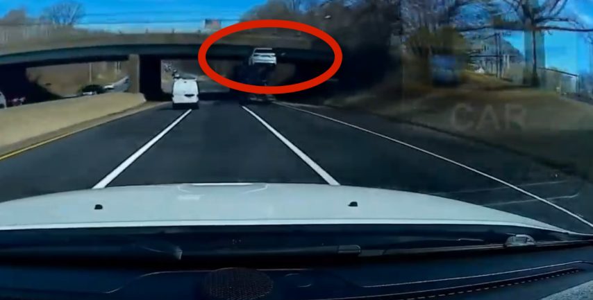 La bisarca trasporta le auto, ma l'altezza è troppa per poter passare sotto al ponte. L'impatto è inevitabile e viene registrato dalla dashcam a bordo di un'auto poco dietro.