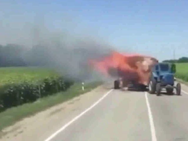 Un carico di fieno completamente bruciato e distrutto dalle fiamme. In una strada di campagna di una località anonima in Ucraina, viene registrato questo video. L'autista prova a fermare le fiamme come può, ma i tentativi sono vani.