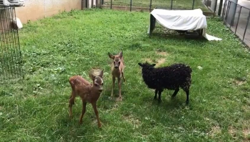 Due cerbiatti e un agnellino giocano insieme al Canc - Centro Animali Non Convenzionali di Torino; le immagini sono state postate dai veterinari della struttura su Facebook.
