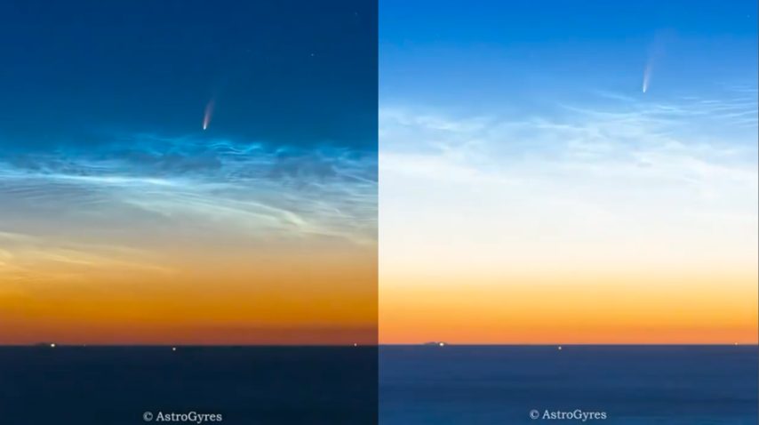 Immagini mozzafiato quando sta per sorgere il sole e cin nuvole nottilucenti: il passaggio della cometa Neowise, catturato verso il mare Adriatico, Il Tetto Del Mondo Castel di Mezzo (Pesaro)