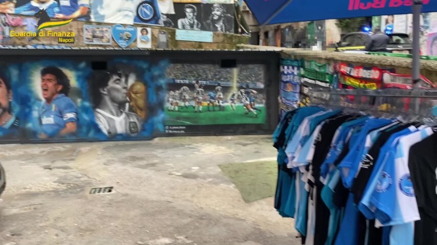 La Guardia di Finanza al Santuario di Maradona: oltre 600 articoli contraffatti venduti dagli abusivi, che "raccoglievano" anche offerte per le foto al murale.