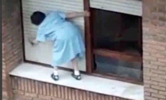 Video ripreso da una donna dal palazzo di fronte mostra una donna, probabilmente che ha superato i 60 anni, che si arrampica ed esce fuori alla finestra dal davanzale restando in bilico. Dopo alcuni secondi e aver terminato rientra dentro come se fosse abituatissima a simili pratiche. Il video da brividi registrato ad Arena di Gijòn in Spagna.