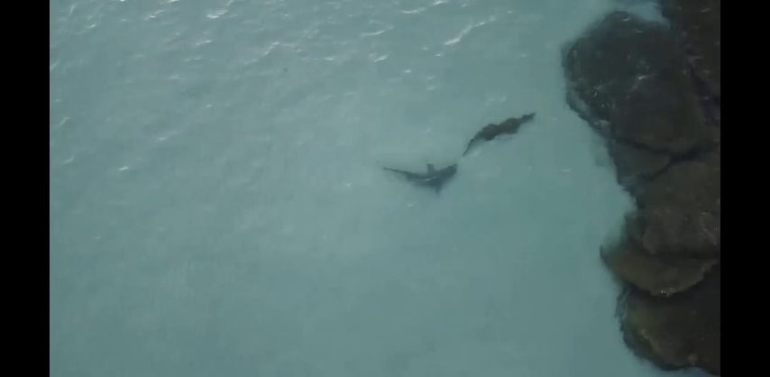 Video ripreso con un drone al largo delle Wessel Islands in Australia. Uno squalo tigre insegue un grosso coccodrillo che però, per sua fortuna, riesce a raggiungere le rocce prima che lo squalo riesca a sferrare l'attacco.