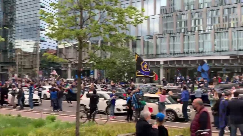 Traffico in tilt al centro di Milano nel pomeriggio di domenica 2 maggio 2021. I festeggiamenti per la vittoria dello scudetto dell'Inter hanno cerato una lunga fila di auto lungo viale della Liberazione, nei pressi di piazza Cadorna e piazza Cairoli, disagi a chi si sposta in città.