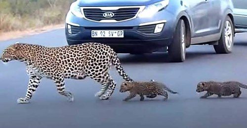 È sempre bello vedere come anche gli animali più selvaggi, con il loro comportamento, riescano a comunicare qualcosa di profondo e dolce. Proprio come accade in questa scena in Sud Africa , nel cuore del Kruger National Park, una delle più grandi riserve faunistiche del continente. Qui vivono gli animali più caratteristici della savana africana, come testimoniano i magnifici leopardi che hanno regalato al mondo una bellissima rappresentazione della vita familiare. In particolare dell'istinto materno: mamma leopardo si preoccupa che i piccoli non corrano alcun pericolo e gli insegna ad attraversare la strada. Si guarda intorno, si frappone tra loro e le auto e quando uno dei cuccioli si ferma torna indietro a recuperarlo.