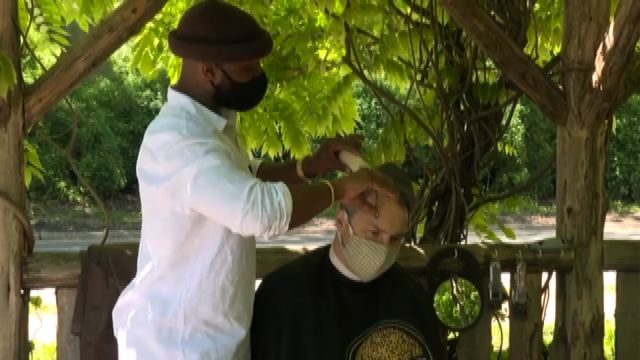 Un barbiere a Central Park, boom di tagli all'aperto con il Covid